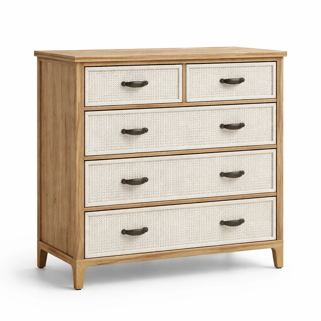 Cajonera de madera con frentes de ratán y tiradores de metal