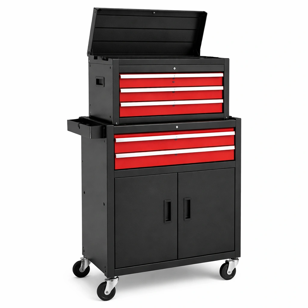 Carro de herramientas de acero rojo y negro con 5 cajones