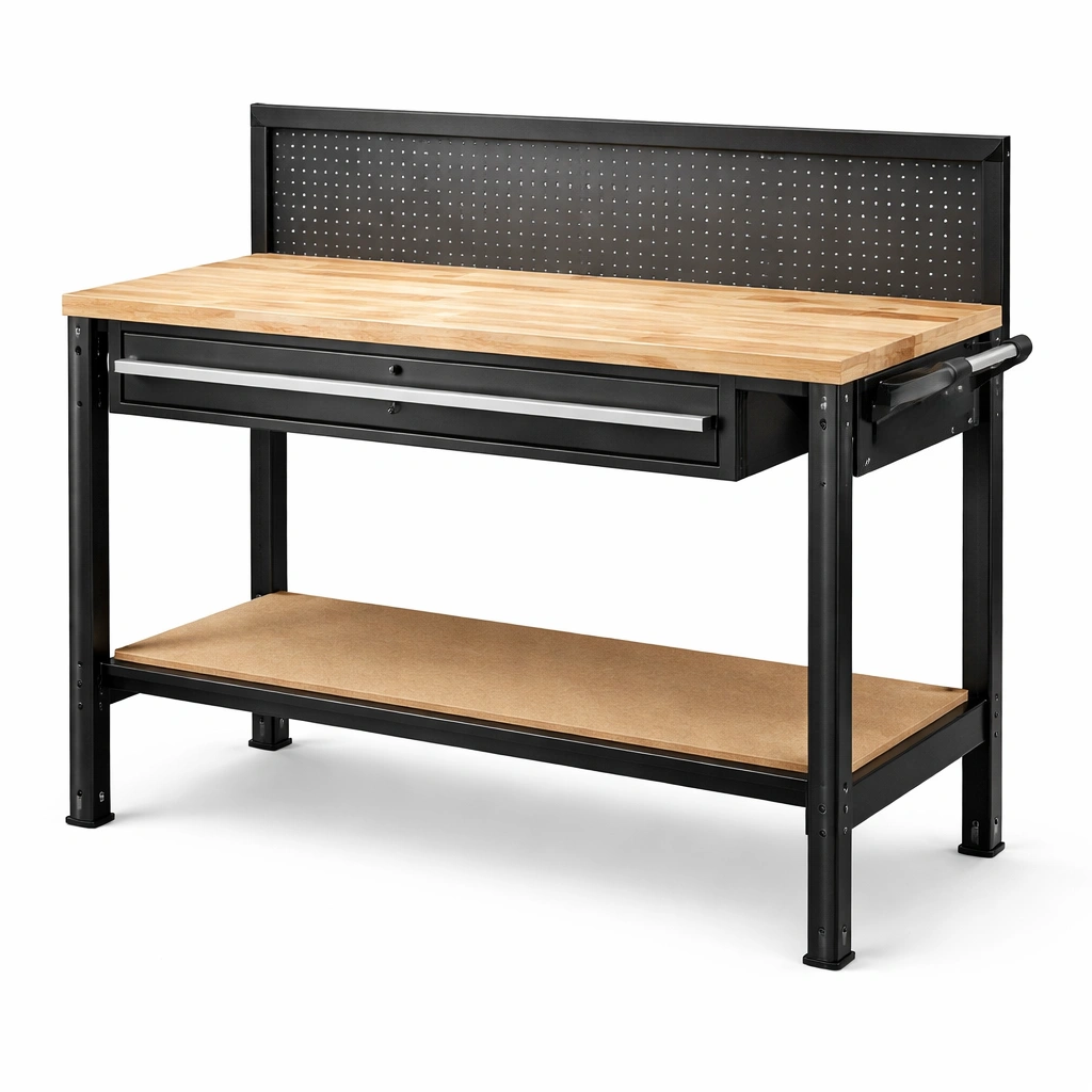 Esta mesa de trabajo cuenta con una superficie de madera maciza, estructura de acero y un estante inferior de MDF. Incluye una gaveta con cerradura y un panel perforado para organizar herramientas. Su capacidad de carga es de 100 kg.