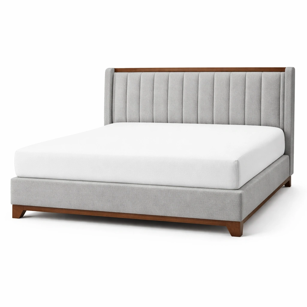 Estructura de cama con cabecera de tela gris y estructura de madera
