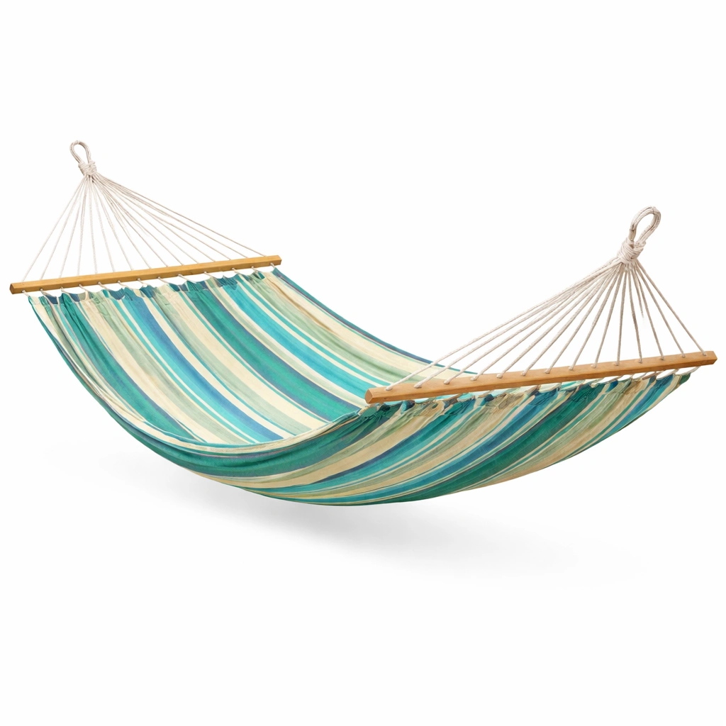 Hamaca de tela de algodón con soporte de madera y cuerdas de poliéster. Uso diseñado para exteriores.