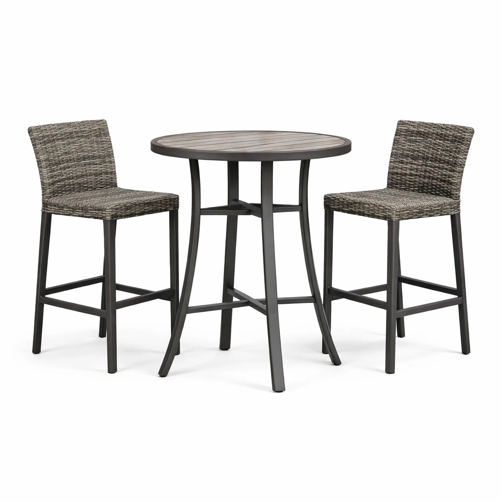 Este conjunto incluye una mesa alta y dos sillas. La estructura de la mesa y las sillas es de metal, mientras que los asientos y respaldos están fabricados en ratán sintético.